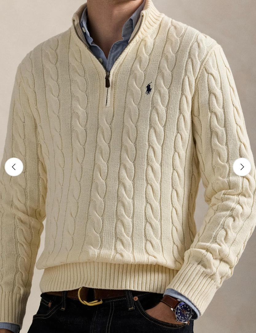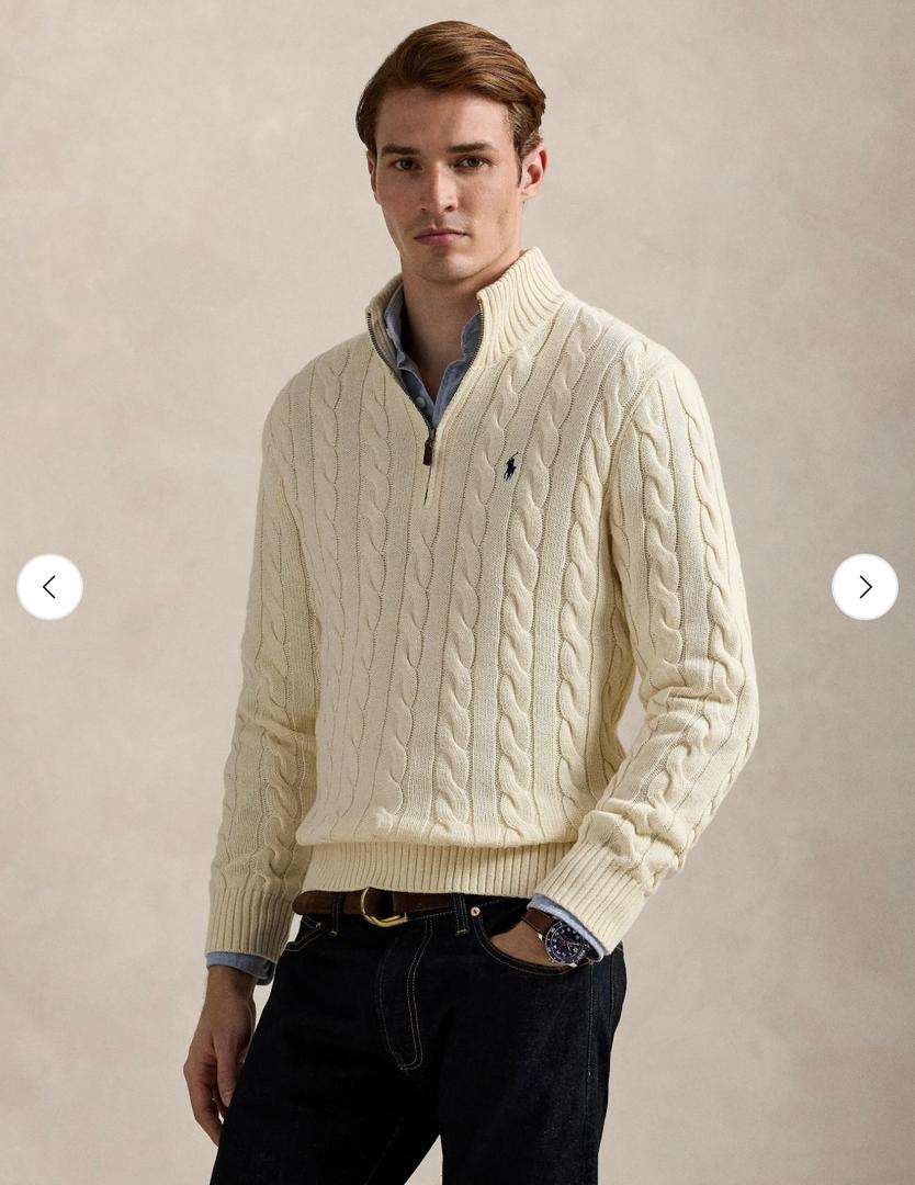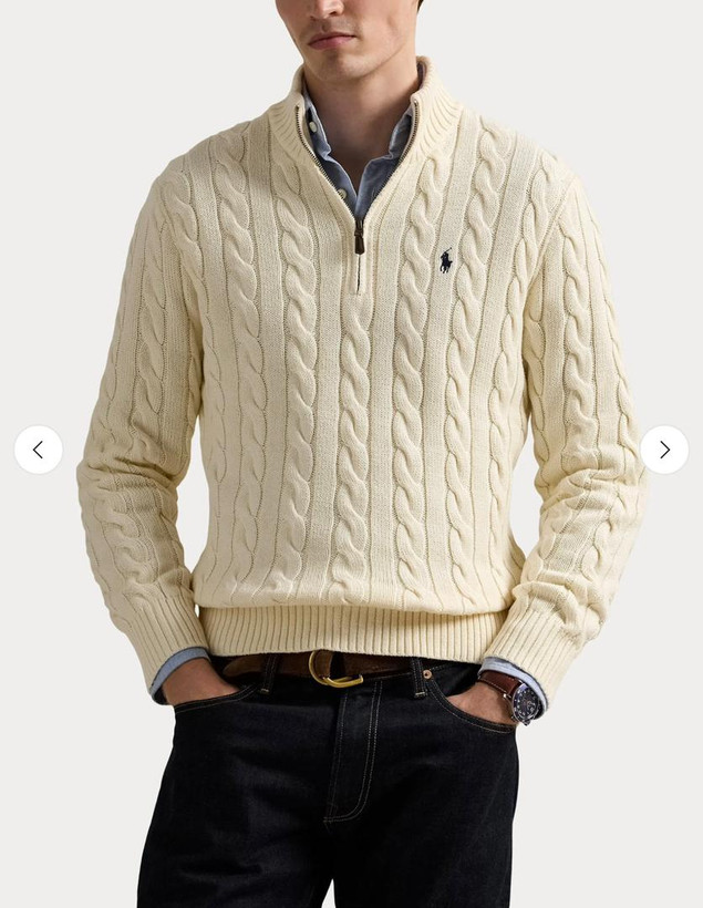 بافت زنجیرهای رالف لورن در رنگ شیری، ظاهری نرم و کلاسیک دارد. این رنگ روشن، زیبایی و جزئیات بافت را به خوبی نمایش میدهد و انتخابی شیک و همهفصل است که در استایلهای رسمی و روزمره به راحتی جلوه میکند.